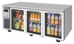 J Series Glass Door Undercounter Side Mount Refrigerator, three-section, 70-7/8"W x 27-1/2"D x 28-3/4"H, 18.74 cu. ft., front air intake, side mount self-contained compressor, (3) glass doors, (3) PE coated wire shelves, LED interior lighting, hot gas condensate system, stainless steel exterior (galvanized steel back & bottom) on aluminum frame, aluminum interior with stainless steel floor, R290 Hydrocarbon refrigerant, 1/4 HP, 115v/60/1-ph, 2.3 amps, NEMA 5-15P, cETLus, ETL-Sanitation