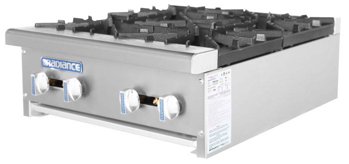 Radiance hot plate, Countertop, 24″ wide, (4) 32,000 BTU burners, Manual controls, Removable grease pan, 16 ga. stainless steel front plate and wrap, Heavy duty removable cast-iron, Grooved top design, Stainless steel pilots, Bull nose stainless steel front extension, Heat resistant on-off knob, 2″ stainless steel standard legs, Regulator included, 128,000 BTU