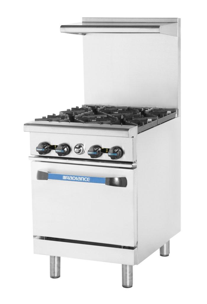 Radiance Restaurant Range, 24″W, (4) 32,000 BTU/hr each lift-off top Open Burners, 1 standard oven w/(1) rack, Stainless steel ext. at front, sides & back riser lift-off high shelf, Full stainless steel oven interior, Adjustable oven thermostat, 26.3″ Depth standard, 6″ stainless steel adjustable legs standard, Regulator included, 163,000 BTU total