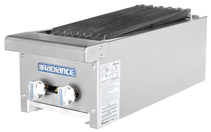 Radiance Charbroiler, Countertop, 12″ wide, 16 ga. stainless steel front plate and wrap, Heavy duty cast iron radiants and grates, (2) burners with manual controls, Removable grease pan, Stainless steel pilots, Bull nose stainless steel front extension, Heat resistant on-off knob, 2″ stainless steel standard legs, Regulator included, 30,000 BTU