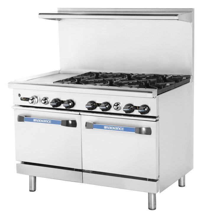 Radiance Restaurant Range, 48″W, (6) 32,000 BTU Open Burners, 12″ Griddle (left side), 2 standard ovens w/(1) rack, Stainless steel ext. at front, Sides & back riser lift-off high shelf, Full stainless steel oven interior, Adjustable oven thermostat, 26.3″ Depth standard, 6″ stainless steel adjustable legs standard, Regulator included, 277,000 BTU total
