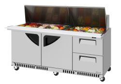 Super Deluxe Food Prep Tables- Drawers, Self-Cleaning condenser, Digital temperature control & monitor system, Front Breathing airflow, 17.6 cu. ft., 72-5/8"W x 37"D x 44-3/8"H, Cold bunker system, stainless steel interior & exterior (galvanized steel back & bottom), High-density polyurethane insulation, Insulated pan cover, 9-1/2"deep cutting board, R290 Hydrocarbon refrigerant, 3/8 HP, 115v/60/1-ph, 9.9 amps, NEMA 5-15P, cETLus, ETL-Sanitation (contact sales for lead time)