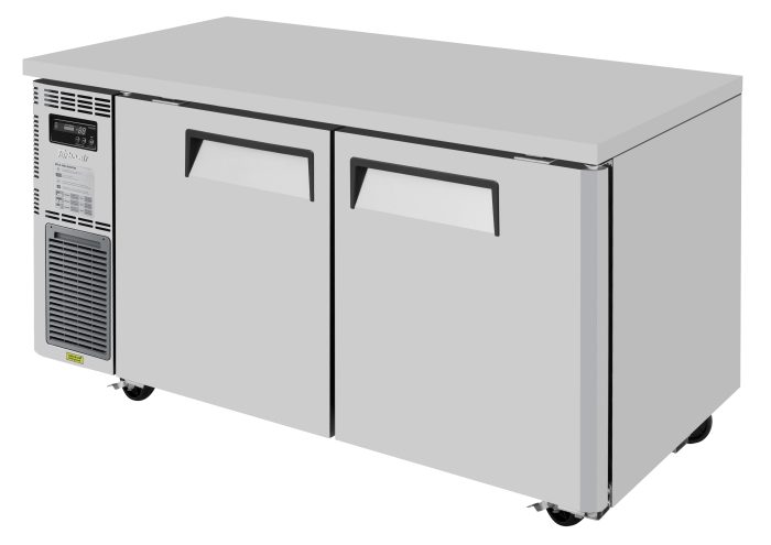 J Series Side Mount Undercounter Freezer, two-section, 59″W x 27-1/2″D x 28-3/4″H, 13.58 cu. ft., front air intake, side mount self-contained compressor, (2) stainless steel doors with recessed handles, (2) PE coated wire shelves, LED interior lighting, stainless steel exterior (galvanized steel back & bottom), aluminum interior & door liners with stainless steel floor, R290 Hydrocarbon refrigerant, 1/2 HP, 115v/60/1-ph, 4.8 amps, NEMA 5-15P, cETLus, ETL-Sanitation